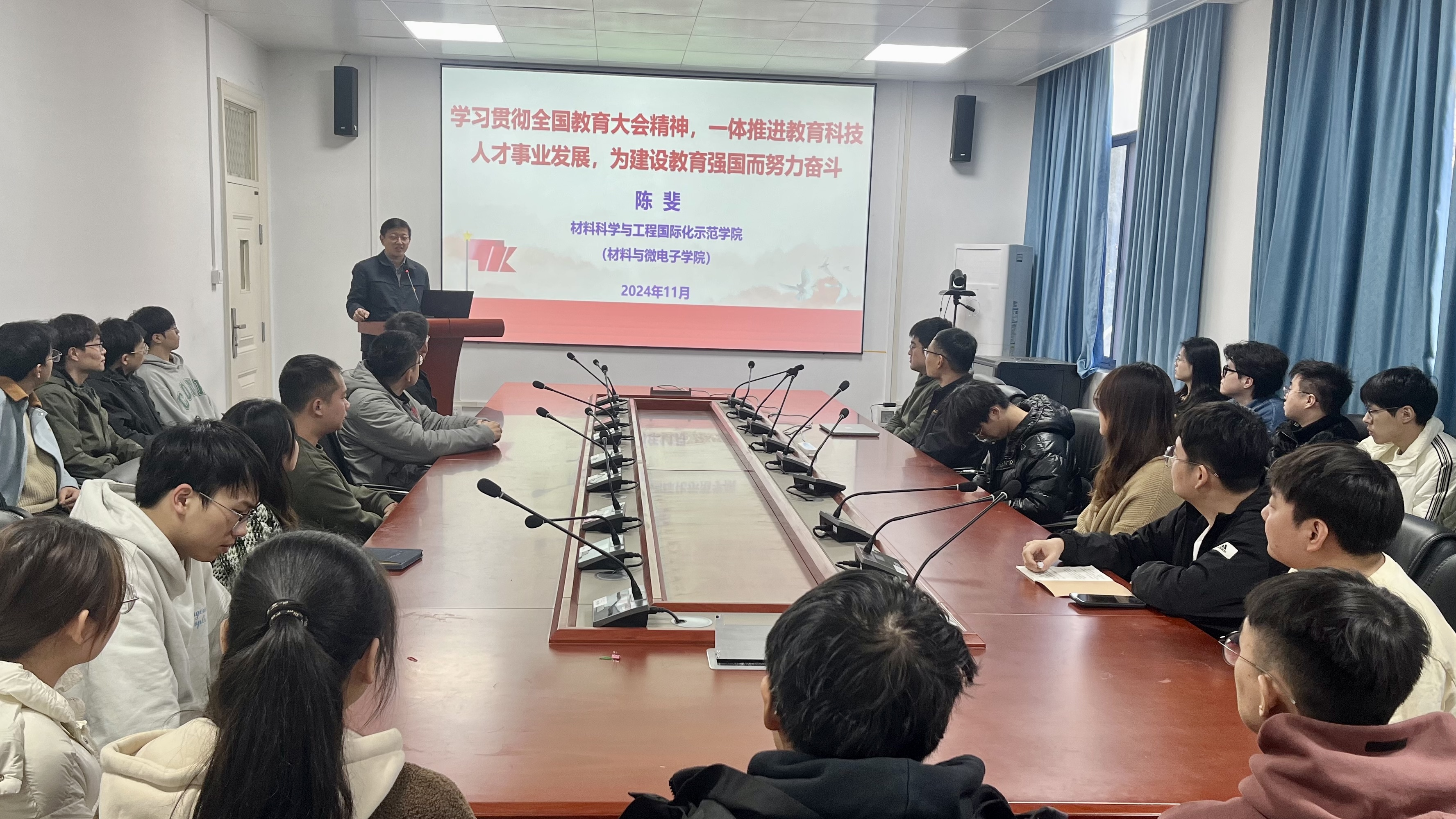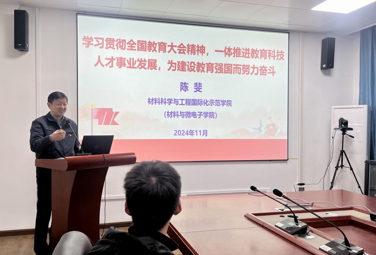 11月25日上午,学院副院长陈斐教授以“学习贯彻全国教育大会精神,一体推进教育科技人才事业发展,为建设教育强国而努力奋斗”为主题,从新时代我国科技事业取得的历史性成就、科技创新在教育和人才事业发展中的动力源作用和如何更好发挥科技在教育和人才事业中的动力源作用三个方面为功能梯度材料研究生党支部带来了一堂生动的专题党课。