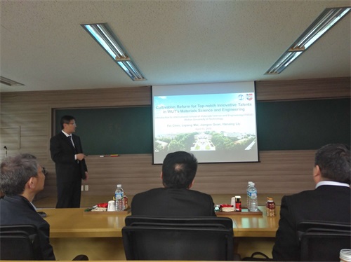 4月11日,代表团访问了高丽大学,受到了工学院Woong Kim教授的热情接待,并参与了该校工学院组织的专家学者座谈会。座谈会上,陈斐教授首先介绍了国际化示范学院近几年的发展过程和重大成果。随后,麦立强教授就自己的研究方向进行了专题报告,深刻地体现了国际化示范学院在科研上的突出成果。最后,双方就院系合作、学生交流、项目合作等事宜进行了深入调研交流,高丽大学教授们表示希望与国际化示范学院建立合作联系,促进两院之间的交流合作。
