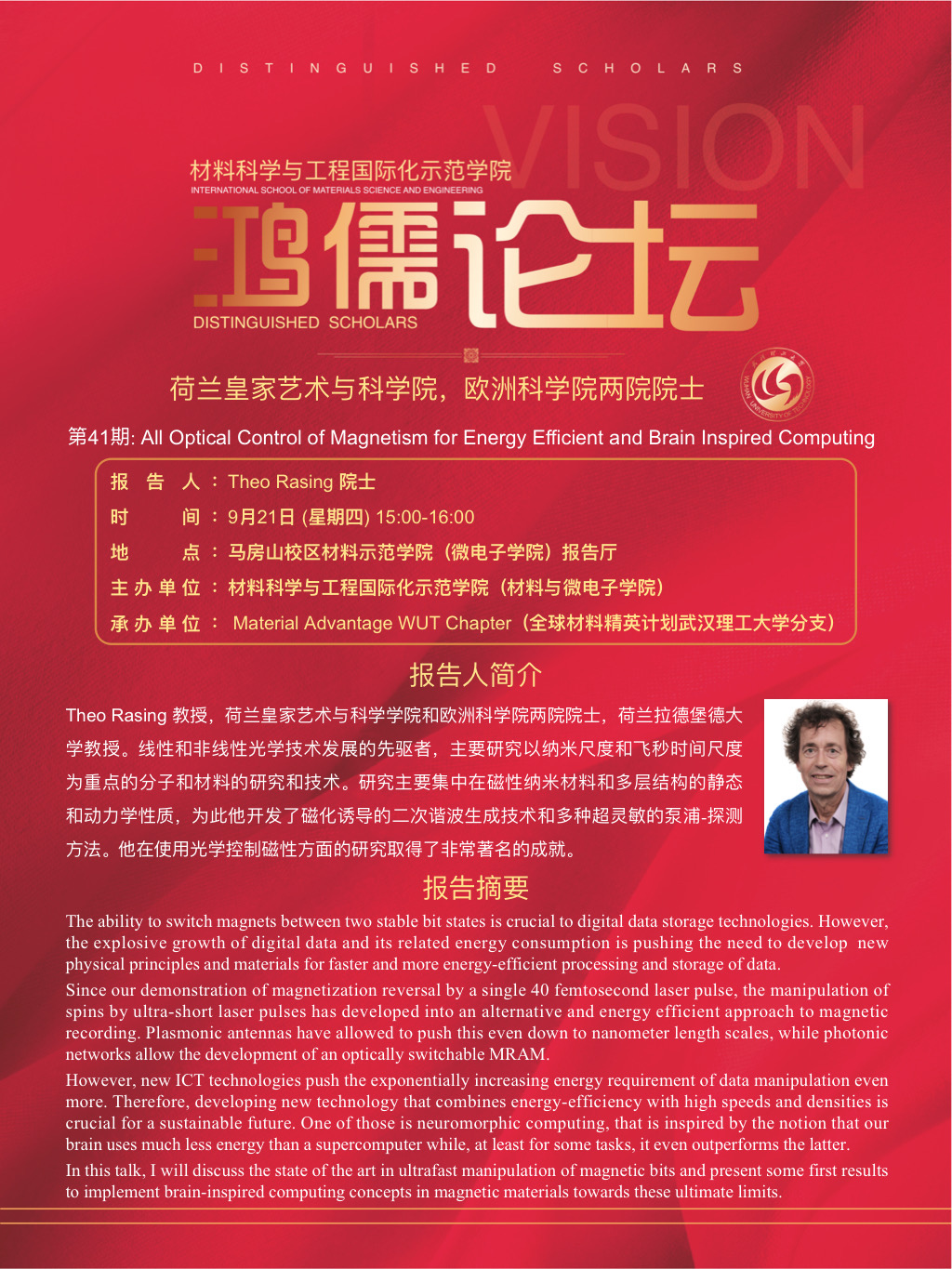 【鸿儒论坛】第41期:荷兰皇家艺术与科学院,欧洲科学院两院院士Theo Rasing教授学术报告会