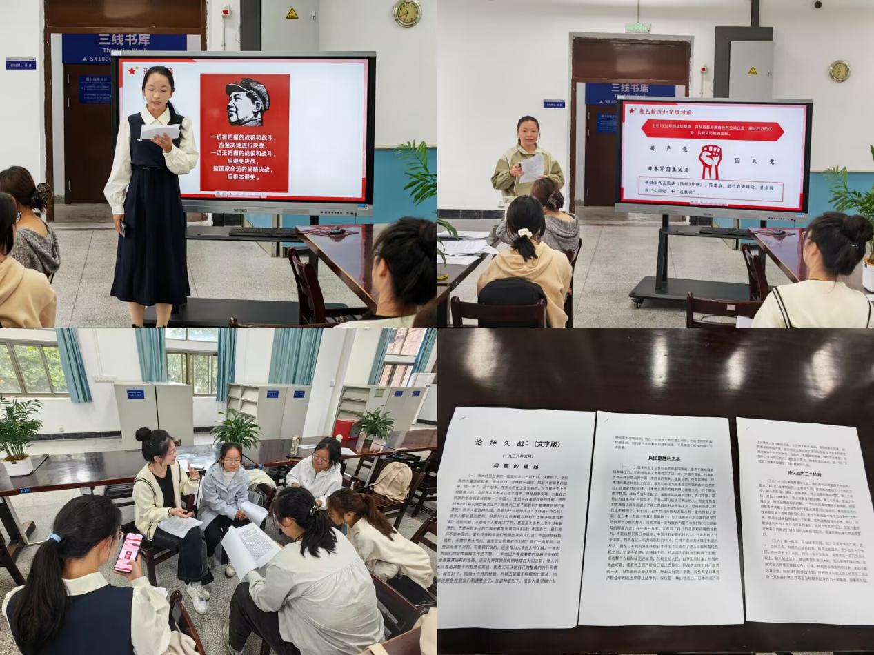 本次读书会聚焦《论持久战》的“问题的提起”“持久战的三个阶段”“为永久和平而战”等章节,通过原文阅读、分组辩论、创意设计等多种创新环节带领同学们一步步读懂《论持久战》这本经典著作。在民族存亡的紧要关头、在“亡国论”和“速胜论”两种思想席卷全国之际,《论持久战》应运而生,驱散迷思,点亮灯塔。书籍深入剖析了抗日战争必将赢得最终胜利的历史必然性,为当时的民众带来了珍贵的精神指引。