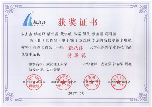 我院特等奖作品-自然科学学术论文《电子/离子双连续传导的高倍率纳米电极材料》(指导老师:麦立强、韩春华、周亮;作者:朱杰鑫等)从设计构筑具有电子/离子双连续传导结构的高倍率纳米电极材料出发,对多种复合形式的电极材料的电化学倍率性能提升进行了系统研究,极大地提高了电极材料的电子运输能力和降低离子迁移阻力,对进一步开发和设计高倍率的纳米电极材料具有重要的指导意义。该项目成员已发表相关SCI论文3篇,在审2篇,申请受理国家发明专利3项,进行大学生创新创业训练计划项目1项。作品具创新性体现在:首次提出高效的电子/离子双连续传导策略,并设计多种电极材料复合形式;优化电极活性材料形貌结构,提升离子输运能力;构筑不同碳基导电网络,协同提升电极材料电子输运能力。