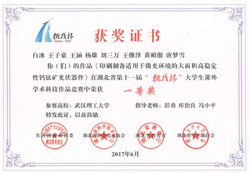 我院一等奖作品-科技制作发明B类《印刷制备适用于微光环境的大面积高稳定性钙钛矿光伏器件》(指导老师:彭勇、库治良、冯小平;作者:白冰等)通过含Cs钙钛矿体系的引入提高了其热稳定性以及水稳定性。同时在封装过程中,向UV胶中添加合适比例的无机物,进一步提高了其隔绝水汽的能力,并且通过两步法工艺有效的改善了大面积成膜难的问题,制备出的钙钛矿光伏器件具有稳定性好、光电转换效率高等特点,能够有效利用无处不在的光能,节能环保,推动清洁能源的发展,符合可持续发展战略,对光伏行业有促进及革新意义,具有良好的研究价值,经济效益和社会效益显著。该项目成员拥有成果包括两篇发明专利受理,十篇实用新型专利受理,同时还和武汉市城市合伙人企业签订了合作意向书,受到武汉大学钱俊教授的亲笔推荐。