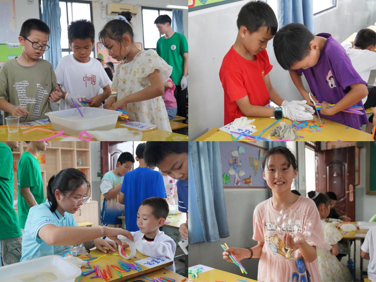 “影响水表面张力的因素有哪些呢?”在同学们对表面张力有了初步的认识后,喻嘉乐老师进一步的提出了更有挑战性的问题。看着同学们百思不得其解的样子,喻老师提示同学们可以从不同种类的液体入手。这一提示点燃了同学们,通过实验,大家发现加入白糖的水表面张力更强。在此基础上,喻嘉乐老师带领同学们一同制作了简易的泡泡机,化无形为有形,让同学们在缤纷的泡泡中体悟自然科学的魅力。