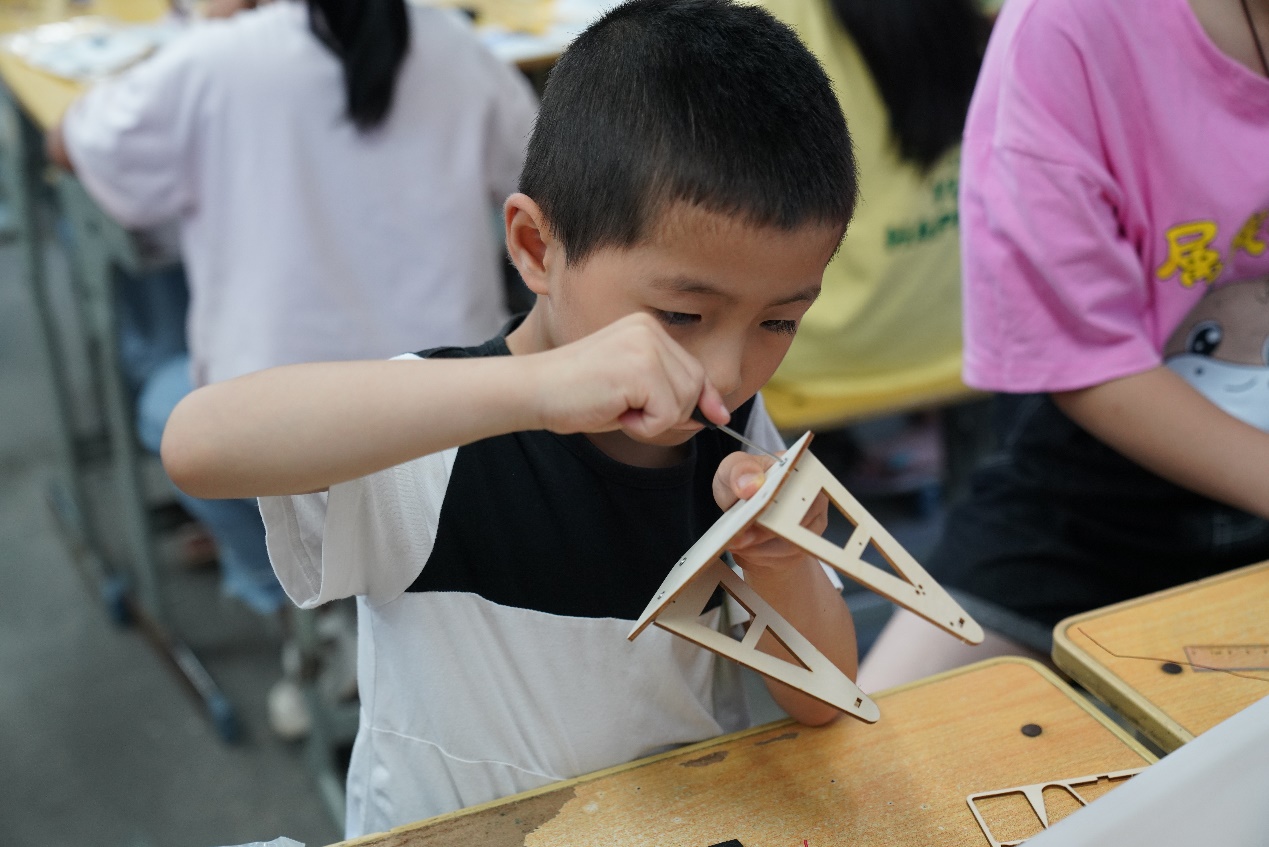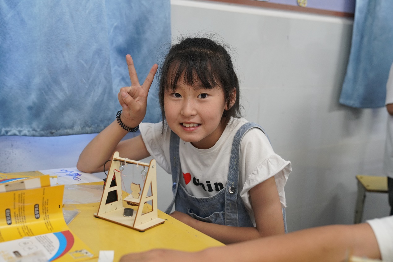 在同学们激动的心情下,老师发放了实验用具,并在台上讲解了示范步骤和注意事项,随即开始了动手实验。在老师的引导下,同学们把正负极理解成小孩子的手和脚,顺利地完成了器件的组装。同学们激动地向老师展示自己设计改装的精美秋千,接通电源后,只轻轻一推,所有同学的秋千都不停地摆动起来。